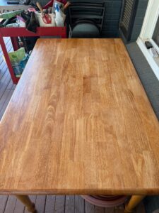 I’ve also been working with my hands. I inherited my dad’s kitchen table. After so many Tuesdays of hot meals on paper plates, three round, slightly worn patches were left. The first thing I did when I got home from my road trip was to refinish the top. (I marked on Sharpie underneath where our plates had been.) It was something I had promised I would do for at least two years. (Sorry, I don’t have a “before” picture.)