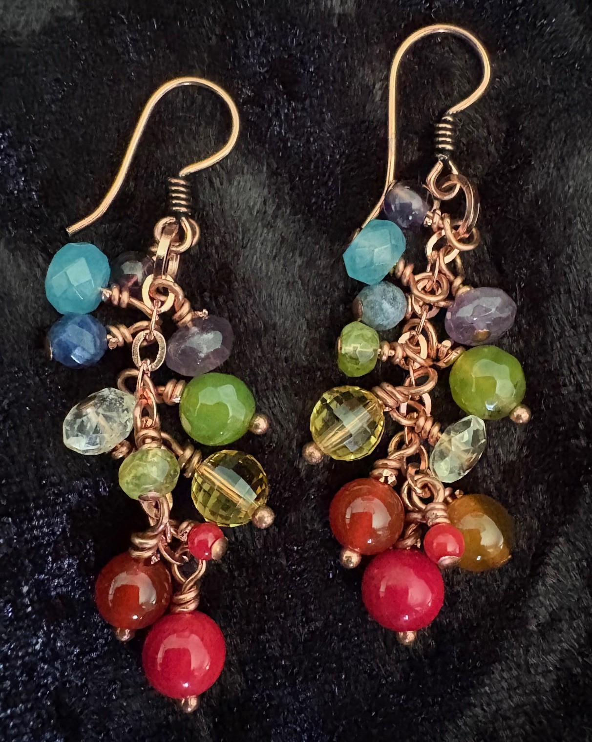 Dangle earrings in copper, natural gemstones. Also in bracelet and choker.